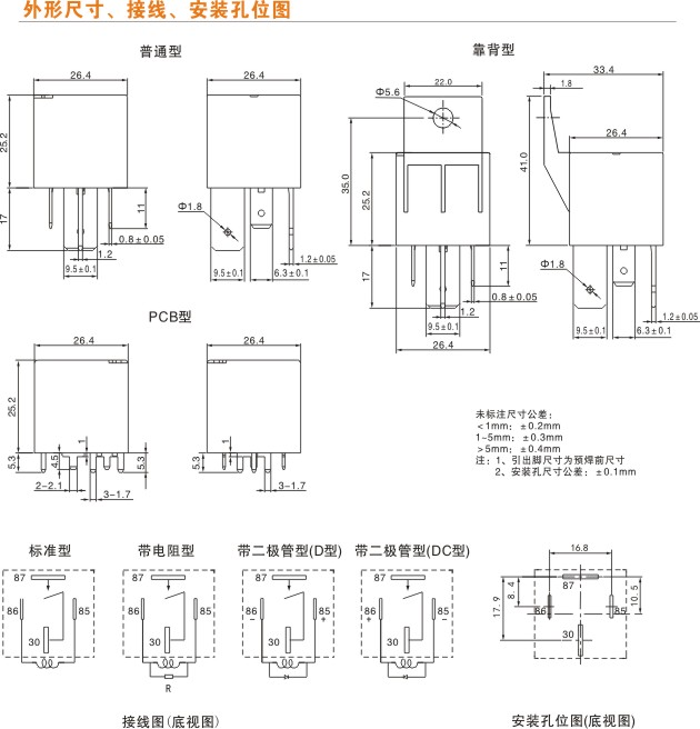 觸點形式繼電器常開或常閉(常見4、6只腳)、轉(zhuǎn)換(常見5只腳或8只腳)