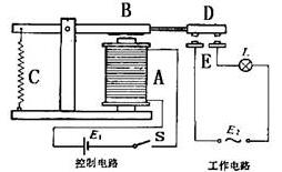 電磁繼電器的構(gòu)造:如圖所示,a是電磁鐵,b是銜鐵,c是彈簧,d是動(dòng)觸點(diǎn),e是靜觸點(diǎn)。電磁繼電器工作電路可分為低壓控制電路和高壓工作電路組成??刂齐娐肥怯呻姶盆Fa、銜鐵b、低壓電源e1和開(kāi)關(guān)組成;工作電路是由小燈泡l、電源e2和相當(dāng)于開(kāi)關(guān)的靜觸點(diǎn)、動(dòng)觸點(diǎn)組成。連接好工作電路,在常態(tài)時(shí),d、e間未連通,工作電路斷開(kāi)。用手指將動(dòng)觸點(diǎn)壓下,則d、e間因動(dòng)觸點(diǎn)與靜觸點(diǎn)接觸而將工作電路接通,小燈泡l發(fā)光。閉合開(kāi)關(guān)s,銜鐵被電磁鐵吸下來(lái),動(dòng)觸點(diǎn)同時(shí)與兩個(gè)靜觸點(diǎn)接觸,使d、e間連通。這時(shí)彈簧被拉長(zhǎng),觀察到工作電路被接通,小燈泡l發(fā)光。斷開(kāi)開(kāi)關(guān)s,電磁鐵失去磁性,對(duì)銜鐵無(wú)吸引力。銜鐵在彈簧的拉力作用下回到原來(lái)的位置,動(dòng)觸點(diǎn)與靜觸點(diǎn)分開(kāi),工作電路被切斷,小燈泡l不發(fā)光。