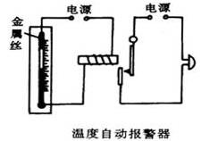 溫度自動(dòng)報(bào)警器:當(dāng)溫度升高到一定值時(shí),水銀溫度計(jì)中水銀面上升到金屬絲處,水銀是導(dǎo)體。因此將電磁鐵電路接通,電磁鐵吸引彈簧片,使電鈴電路閉合,電鈴響報(bào)警,當(dāng)溫度下降后,水銀面離開(kāi)金屬絲,電磁鐵電路斷開(kāi),彈簧片回原狀,電鈴電路斷開(kāi),電鈴不再發(fā)聲。
