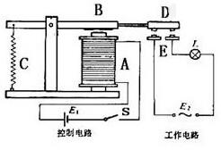 工作原理:電磁鐵通電時(shí),把銜鐵吸下來使D和E接觸,工作電路閉合。電磁鐵斷電時(shí)失去磁性,彈簧把銜鐵拉起來,切斷工作電路。