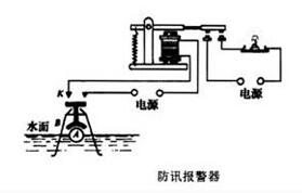防訊報(bào)警器:K是接觸開關(guān),B是一個(gè)漏斗形的竹片圓筒,里面有個(gè)浮子A,水位上漲超過警戒線時(shí),浮子A上升,使控制電路接通,電磁鐵吸下銜鐵,于是報(bào)警器指示燈電路接通,燈亮報(bào)警。
