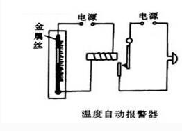溫度自動(dòng)報(bào)警器:當(dāng)溫度升高到一定值時(shí),水銀溫度計(jì)中水銀面上升到金屬絲處,水銀是導(dǎo)體。因此將電磁鐵電路接通,電磁鐵吸引彈簧片,使電鈴電路閉合,電鈴響報(bào)警,當(dāng)溫度下降后,水銀面離開金屬絲,電磁鐵電路斷開,彈簧片回原狀,電鈴電路斷開,電鈴不再發(fā)聲。